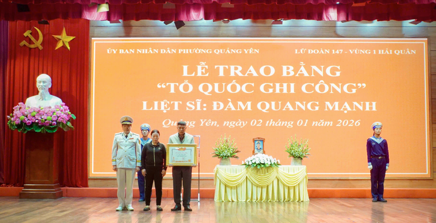 Trong không khí trang nghiêm, xúc động, Chuẩn đô đốc Vũ Văn Nam đã trao Bằng “Tổ quốc ghi công” của Thủ tướng Chính phủ (theo Quyết định số 2705/QĐ-TTg, ngày 12/12/2025) tới thân nhân liệt sĩ.
