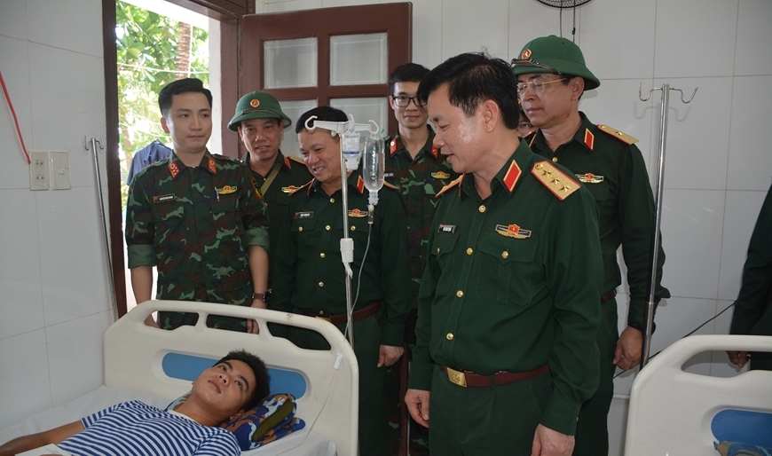 Đồng chí Thượng tướng Đỗ Xuân Tụng, Ủy viên Trung ương Đảng, Phó Chủ nhiệm Tổng cục Chính trị QĐND Việt Nam thăm các chiến sĩ đang nằm điều trị tại Bệnh xá Trung tâm đảo Nam Yết