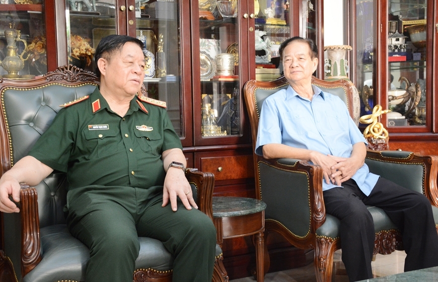 Đồng chí Đại tướng Nguyễn Trọng Nghĩa, Ủy viên Bộ Chính trị, Bí thư Trung ương Đảng, Ủy viên Thường vụ Quân ủy Trung ương, Chủ nhiệm Tổng cục Chính trị QĐND Việt Nam thăm hỏi, trò chuyện cùng nguyên Thủ tướng Chính phủ Nguyễn Tấn Dũng