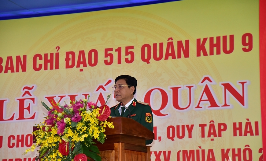 Phát biểu tại Lễ xuất quân, đồng chí Thiếu tướng Huỳnh Văn Ngon cho biết, 24 năm qua, quán triệt sâu sắc chủ trương, chính sách của Đảng, Nhà nước về công tác tìm kiếm, quy tập hài cốt liệt sĩ, đặc biệt là Quyết định số 1515/QĐ-TTg ngày 14/9/2021 của Thủ tướng Chính phủ về việc tìm kiếm, quy tập hài cốt liệt sĩ và xác định danh tính hài cốt liệt sĩ còn thiếu thông tin đến năm 2030 và những năm tiếp theo; Chương trình số 373/CTr-BCĐ ngày 11/02/2022 của Ban Chỉ đạo quốc gia 515 về việc thực hiện nhiệm vụ tìm kiếm, quy tập hài cốt liệt sĩ và xác định danh tính hài cốt liệt sĩ còn thiếu thông tin giai đoạn 2021-2025; với quyết tâm chính trị cao, ý thức trách nhiệm và sự tri ân sâu sắc đối với các anh hùng liệt sĩ, Ban Chỉ đạo 515 Quân khu 9 đã tìm kiếm, quy tập hơn 3.000 hài cốt liệt sĩ trong nước và hơn 8.000 hài cốt liệt sĩ quân tình nguyện, chuyên gia Việt Nam hy sinh tại Campuchia. Đồng chí biểu dương tinh thần, nỗ lực, ý chí và quyết tâm chính trị cao của cán bộ, chiến sĩ các Đội K qua các thời kỳ; đồng thời, yêu cầu lực lượng làm nhiệm vụ tiếp tục phát huy truyền thống cao đẹp Bộ đội Cụ Hồ, giữ vững đoàn kết, phối hợp chặt chẽ với chính quyền và nhân dân Campuchia, bảo đảm an toàn tuyệt đối trong quá trình thực hiện nhiệm vụ; tăng cường quan hệ hợp tác, trao đổi thông tin, phối hợp chặt chẽ với các cơ quan, chính quyền và lực lượng quân sự Campuchia; tôn trọng phong tục, tập quán của nước bạn, góp phần củng cố mối quan hệ hữu nghị, đoàn kết giữa hai dân tộc Việt Nam - Campuchia.
