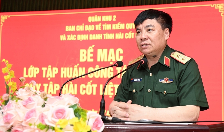 Đồng chí nhấn mạnh, việc tổ chức lớp tập huấn lần này chính là sự thể hiện quyết tâm chính trị của Đảng ủy, Bộ Tư lệnh Quân khu 2 trong thực hiện “Chiến dịch 500 ngày đêm đẩy mạnh thực hiện tìm kiếm, quy tập và xác định danh tính hài cốt liệt sĩ”; yêu cầu, sau lớp tập huấn, các Đội tìm kiếm, quy tập hài cốt liệt sĩ tích cực tổ chức tìm kiếm, quy tập; thường xuyên báo cáo kết quả và rà soát nhu cầu về lực lượng, phương tiện, trang bị kỹ thuật để đề nghị Quân khu 2 và các địa phương bảo đảm. Với mục tiêu đẩy nhanh tiến độ và tinh thần làm việc cao nhất, “chỉ tính ngày, không tính thứ”, quyết tâm hoàn thành xuất sắc nhiệm vụ chiến dịch, đồng chí yêu cầu Bộ CHQS các tỉnh phối hợp đẩy mạnh công tác tuyên truyền về chiến dịch, mở rộng các kênh tiếp nhận thông tin về liệt sĩ, mộ liệt sĩ, nhất là trên báo chí, truyền hình, phát thanh, mạng xã hội và thông tin từ các cựu chiến binh; chăm lo thật tốt đời sống vật chất, tinh thần cho cán bộ, nhân viên, chiến sĩ trong các Đội tìm kiếm, quy tập, gắn với thực hiện tốt công tác thi đua khen thưởng ở các cấp.