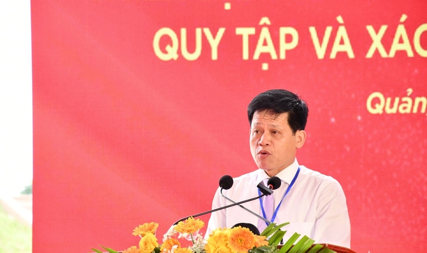 Đồng chí Lê Văn Bảo, Phó Chủ tịch UBND tỉnh, Trưởng Ban Chỉ đạo 515 tỉnh Quảng Trị phát biểu hứa hẹn quyết tâm tại Lễ Phát động “Chiến dịch 500 ngày đêm đẩy mạnh tìm kiếm, quy tập và xác định danh tính hài cốt liệt sĩ”