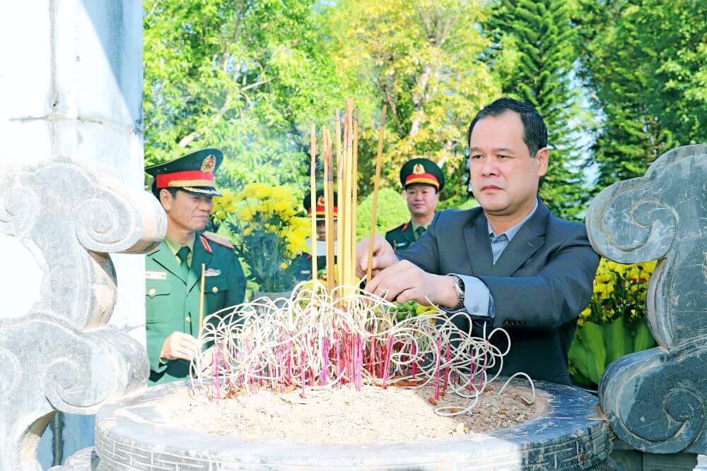 Đồng chí Nghiêm Xuân Cường, Phó Chủ tịch UBND tỉnh Quảng Ninh dâng hương kính viếng các anh hùng liệt sĩ