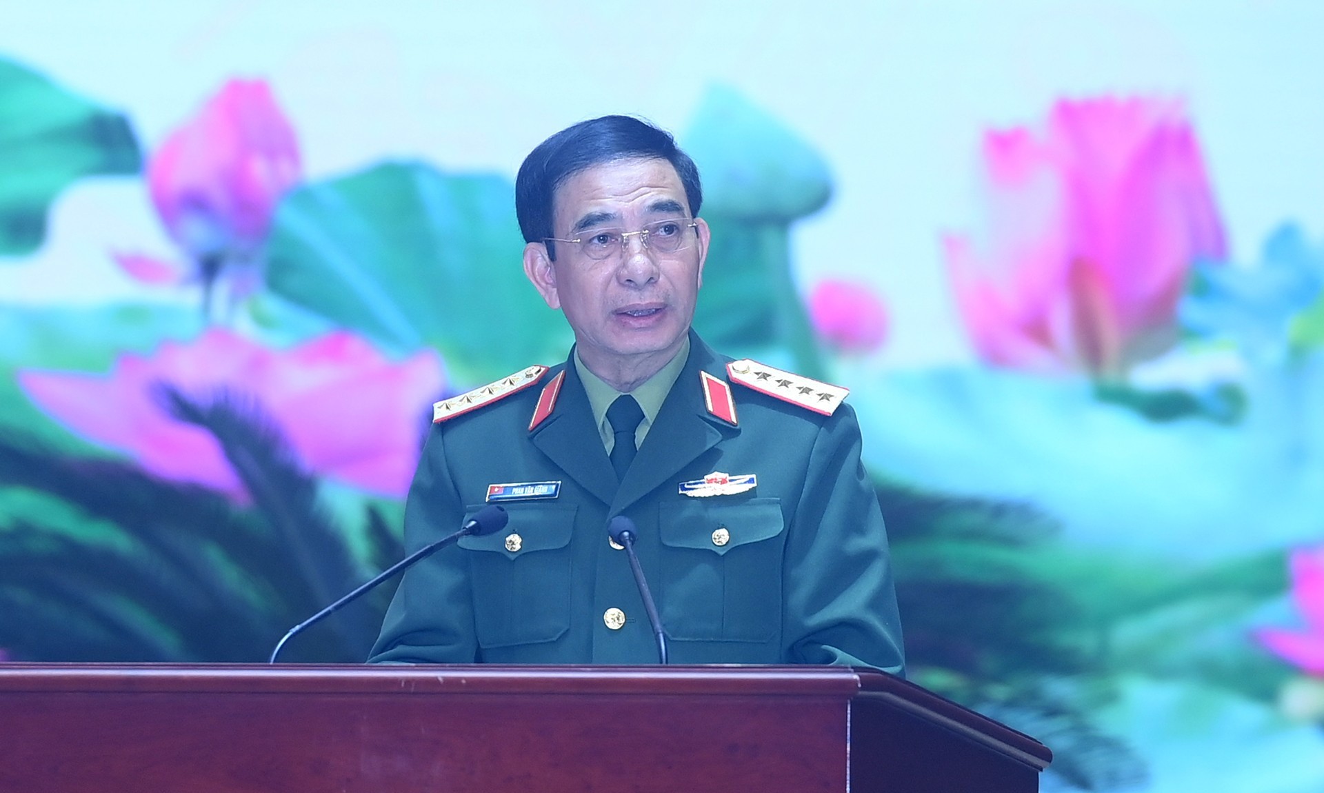 Đồng chí Đại tướng Phan Văn Giang, Ủy viên Bộ Chính trị, Phó Bí thư Quân ủy Trung ương, Bộ trưởng Bộ Quốc phòng phát biểu tại buổi gặp mặt