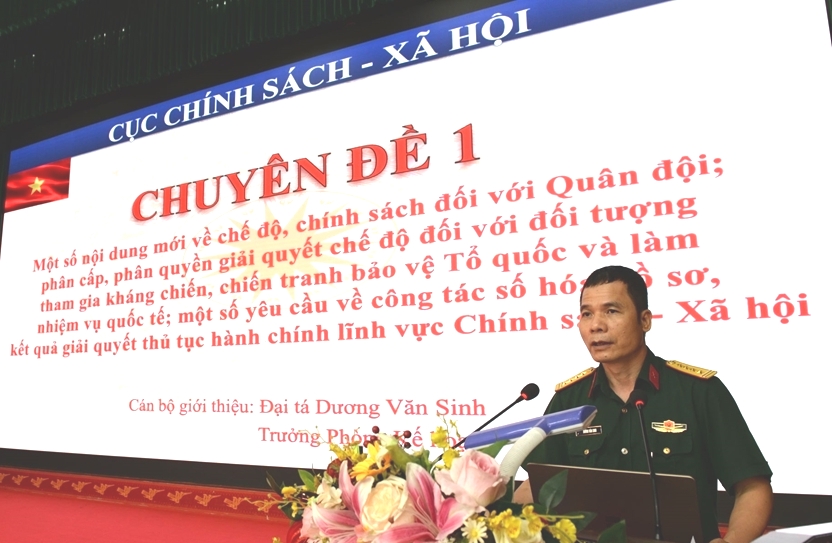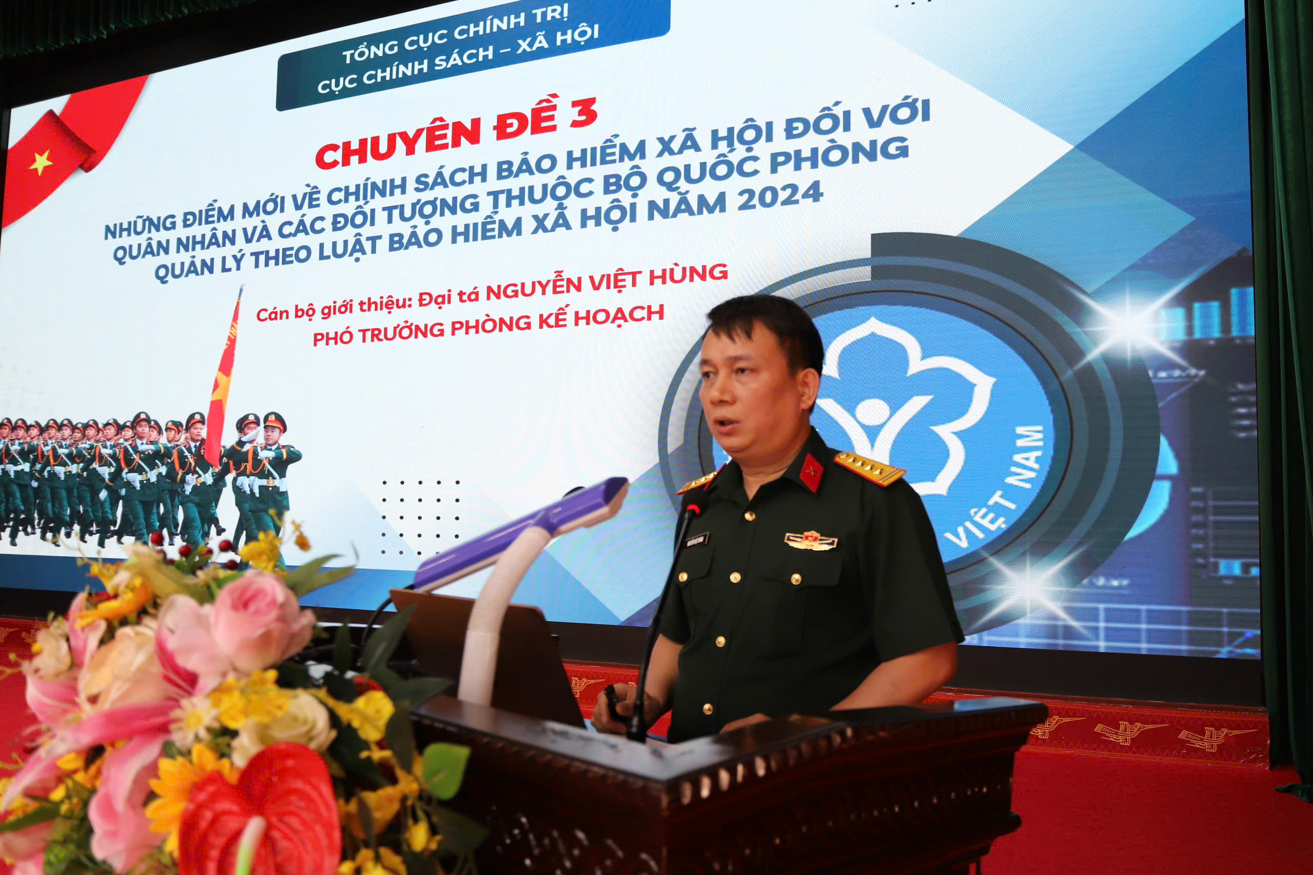 Trong thời gian tập huấn, các đại biểu sẽ được nghiên cứu 7 chuyên đề gồm: Một số nội dung mới về chế độ, chính sách đối với Quân đội; phân cấp, phân quyền giải quyết chế độ đối với đối tượng tham gia kháng chiến, chiến tranh bảo vệ Tổ quốc và làm nhiệm vụ quốc tế; yêu cầu về công tác số hóa hồ sơ, kết quả giải quyết thủ tục hành chính lĩnh vực Chính sách - xã hội; Một số nội dung mới về chế độ, chính sách đối với sĩ quan Quân đội nghỉ hưu, chính sách bảo hiểm xã hội đối với quân nhân và các đối tượng thuộc Bộ quốc phòng quản lý theo Luật bảo hiểm xã hội năm 2024; Một số nội dung cần lưu ý công tác thu nộp bảo hiểm xã hội, bảo hiểm y tế và lập, thực hiện dự toán và báo cáo quyết toán thu, chi bảo hiểm xã hội, bảo hiểm y tế, bảo hiểm thất nghiệp; cấp, quản lý, sử dụng sổ bảo hiểm xã hội, bảo hiểm y tế; chế độ, chính sách đối với lực lượng làm nhiệm vụ tìm kiếm, quy tập hài cốt liệt sĩ…