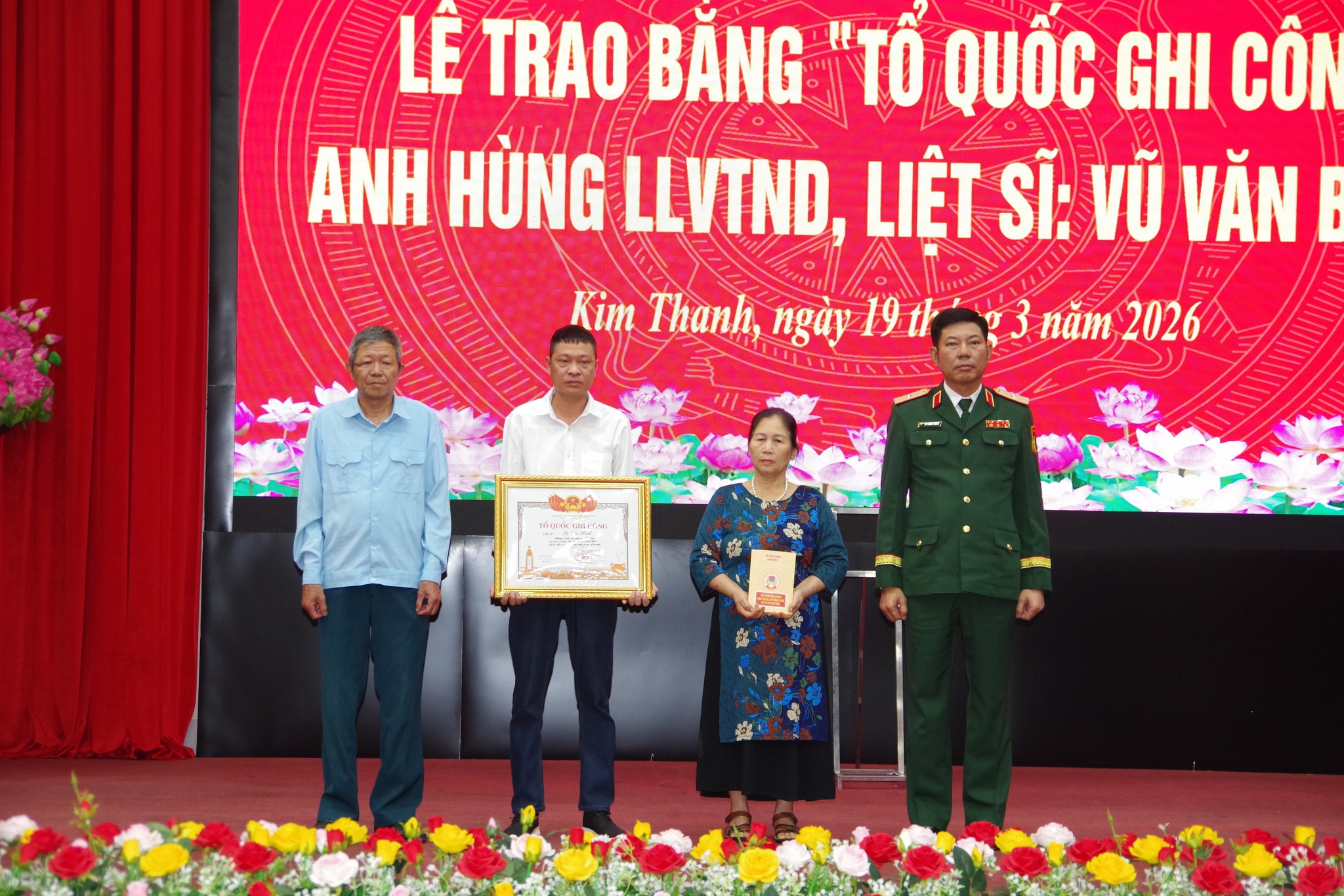 Trong không khí trang nghiêm, xúc động, đồng chí Thiếu tướng Tô Thành Quyết, Phó Tư lệnh Quân khu 3 đã trao Bằng “Tổ quốc ghi công” của Thủ tướng Chính phủ cho thân nhân Anh hùng LLVT nhân dân, liệt sĩ Vũ Văn Bình.